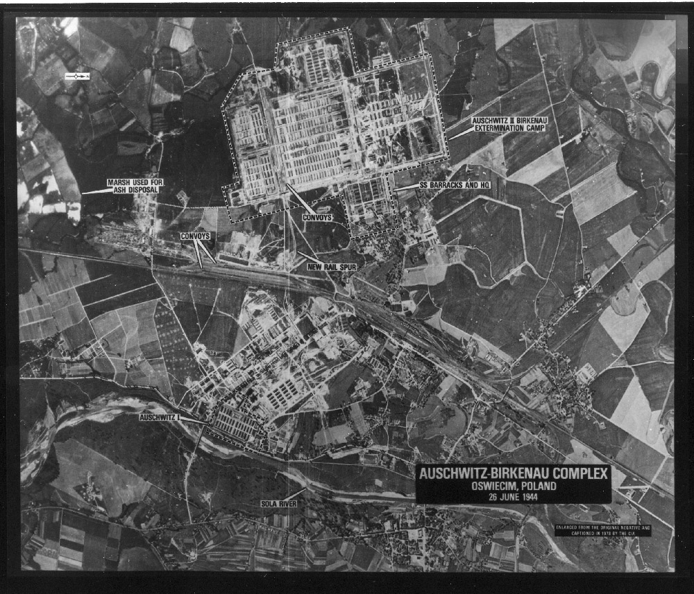 Fotografia lotnicza wykonana przez pilota alianckiego rozpoznawczego RSAAF dnia 26 czerwca 1944 roku przedstawia kompleks obozowy Auschwitz I oraz Auschwitz II (Birkenau). Ze naukowego Archiwum Państwowego Muzeum Auschwitz-Birkenau w Oświęcimiu.