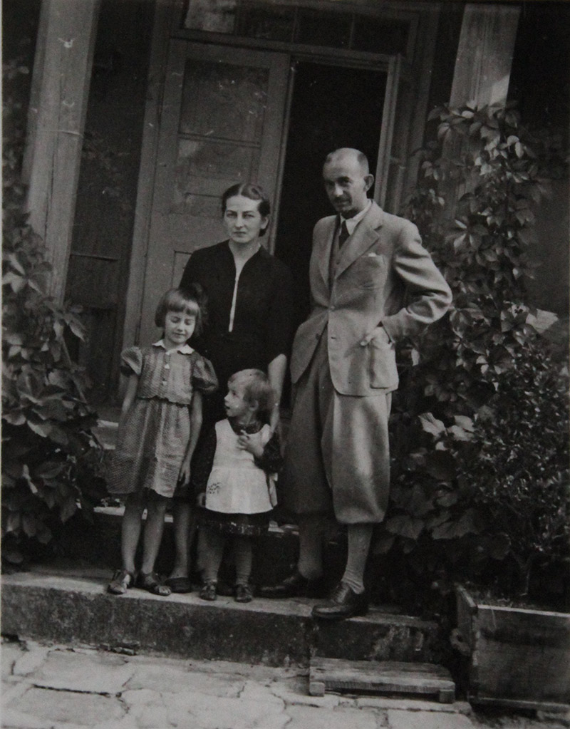 Ludmiła i Tomasz Serafińscy z córkami Beatą i Marią przed Koryznówką, wrzesień 1942 rok. Fotografia ze naukowego Muzeum Pamiątek po Janie Matejce „Koryznówka” w Nowym Wiśniczu.